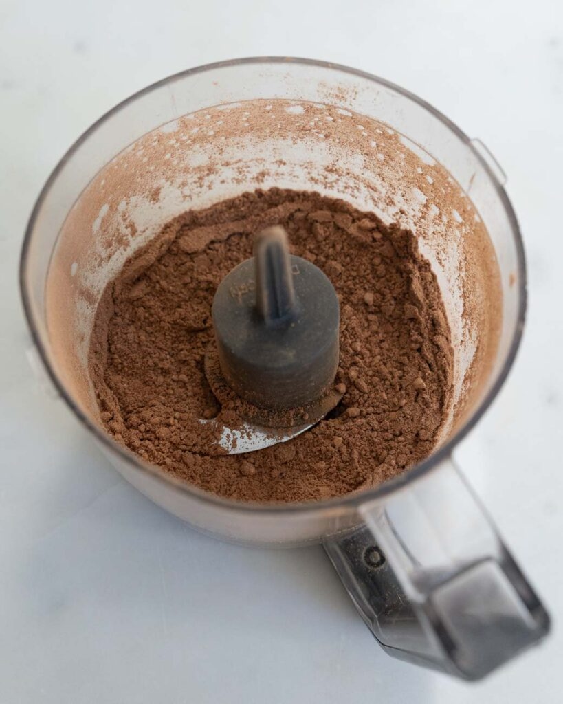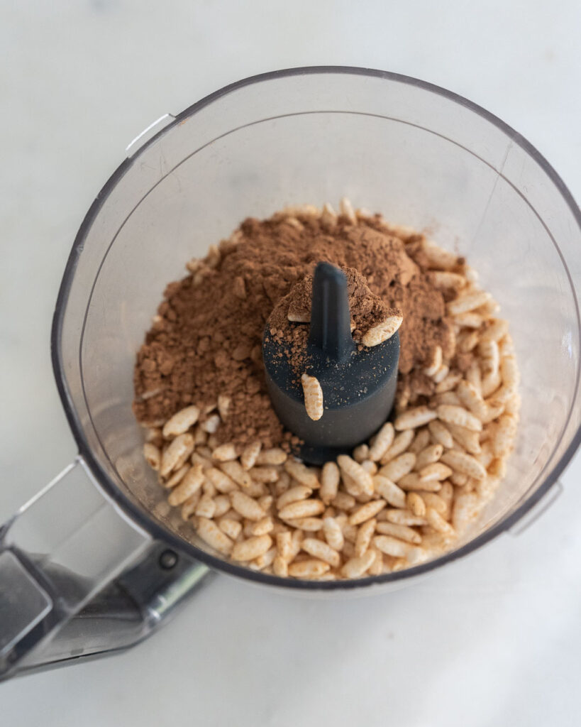 Step 1. In the bowl of a food processor, combine the rice puffs and 2 tbsp of cocoa powder.