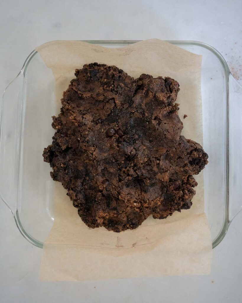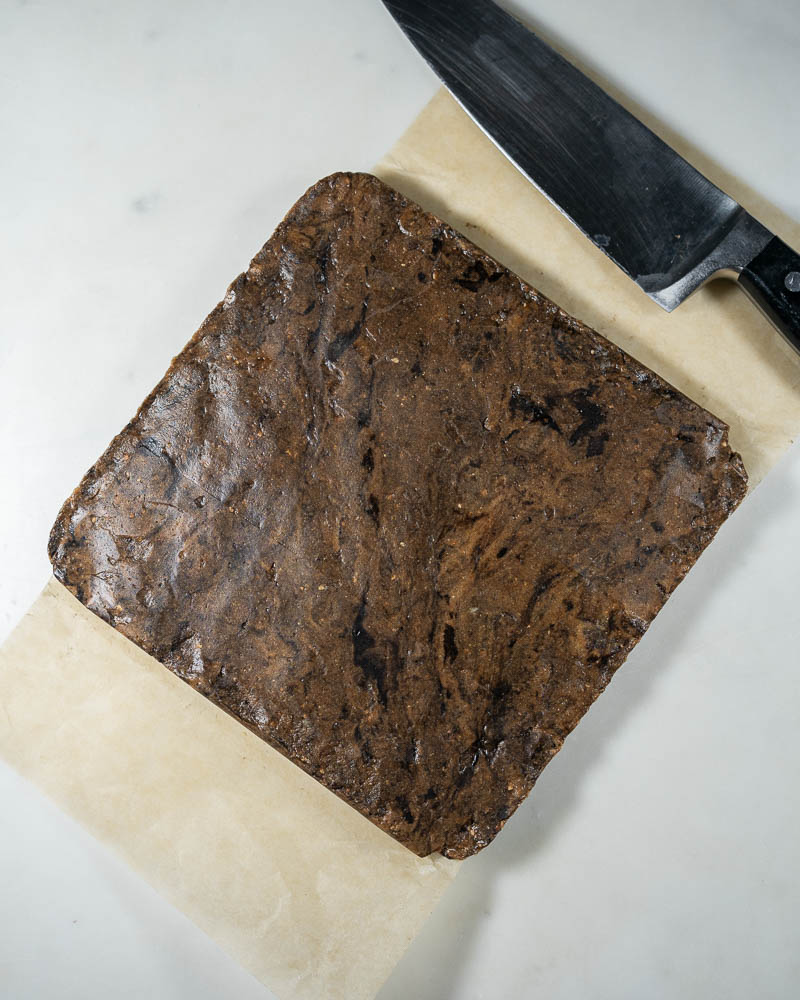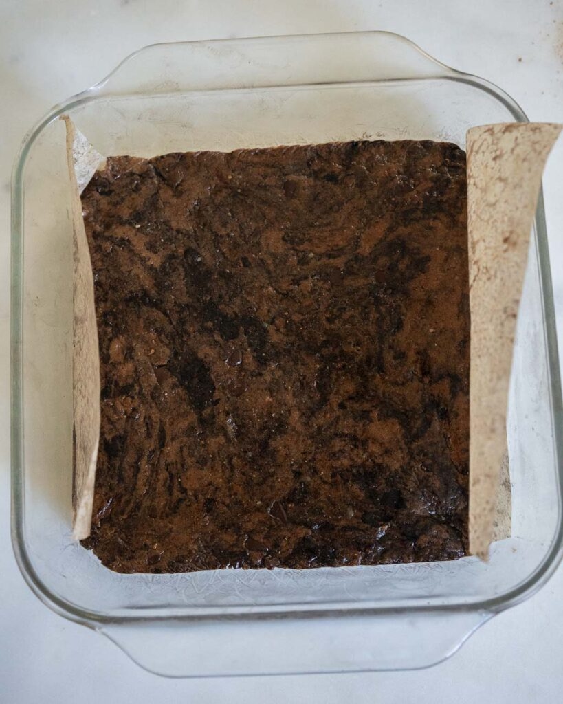 Line an 8×8 baking pan with parchment paper and press the dough firmly into the pan. The dough should be very stiff. It helps to put a piece of parchment on top as well and press on that to smooth it out very firmly and evenly.