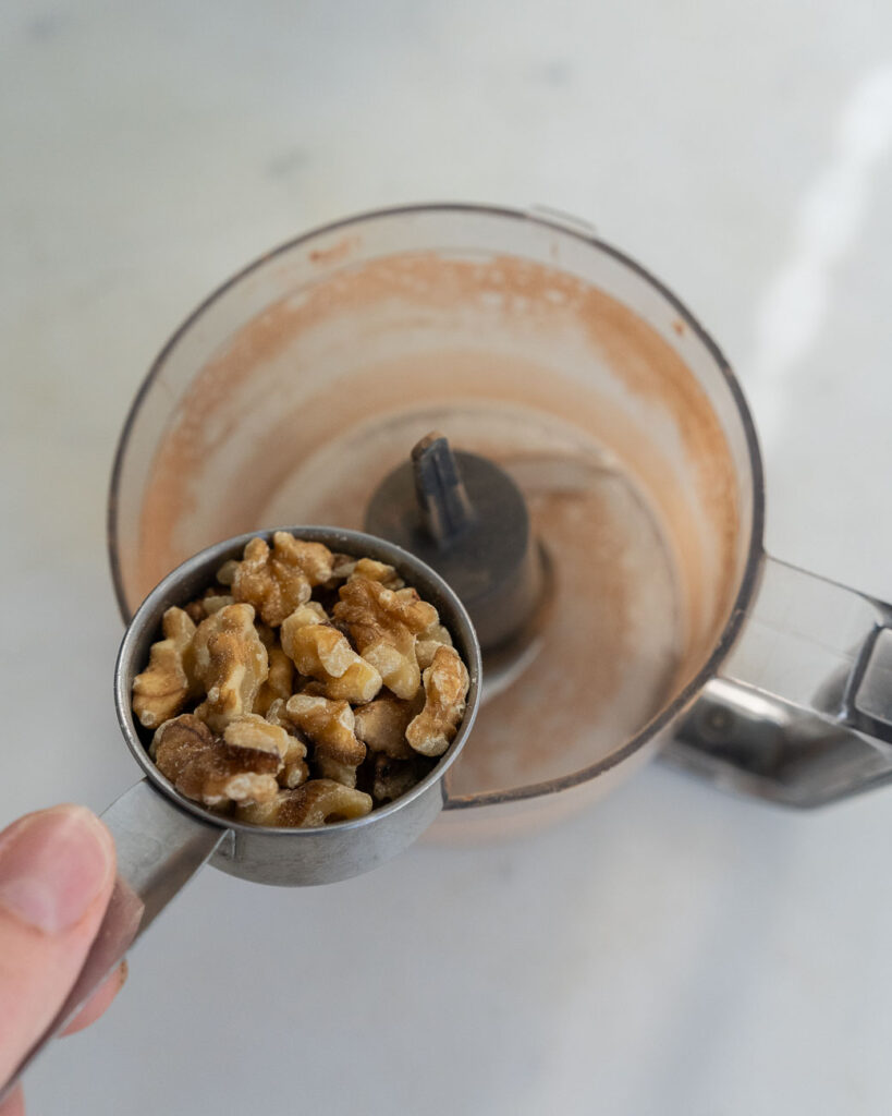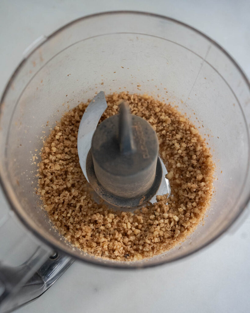 Step 2: Add the nuts (walnuts and/or cashews) to the bowl of the food processor and finely grind.