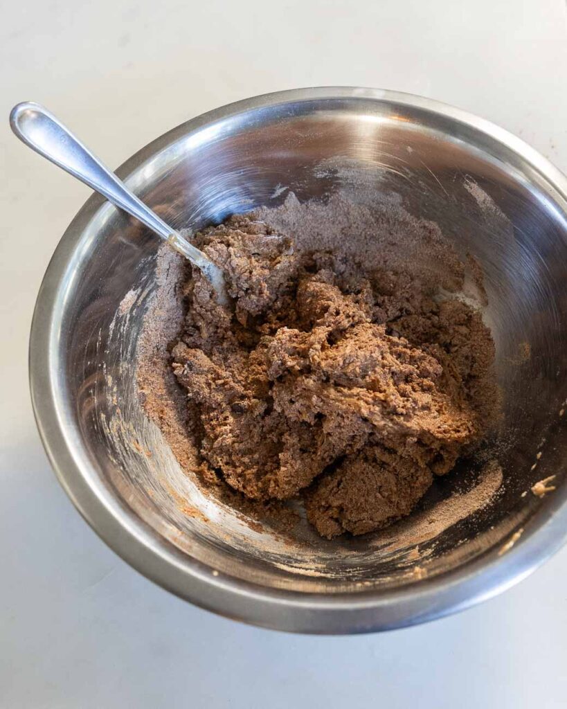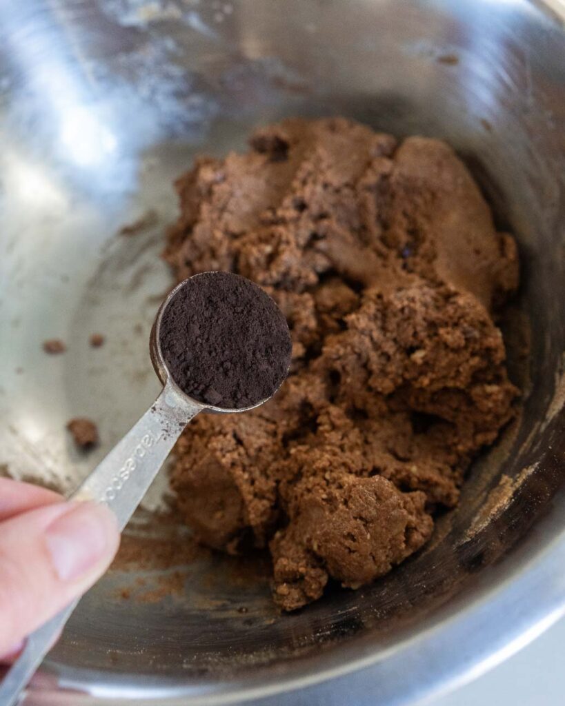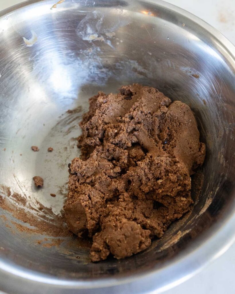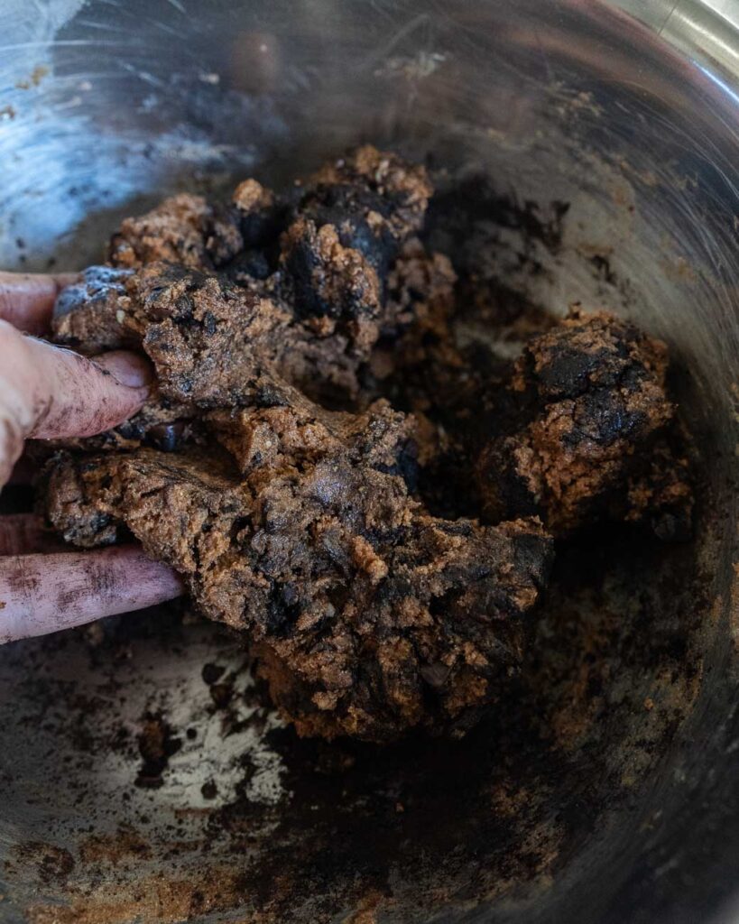 - Add the 1 tbsp black cocoa powder (optional, you can simply add more regular cocoa powder). Combine just enough to give the dough some nice dark chocolate marbling. You may have to use your hands as it will be stiff.