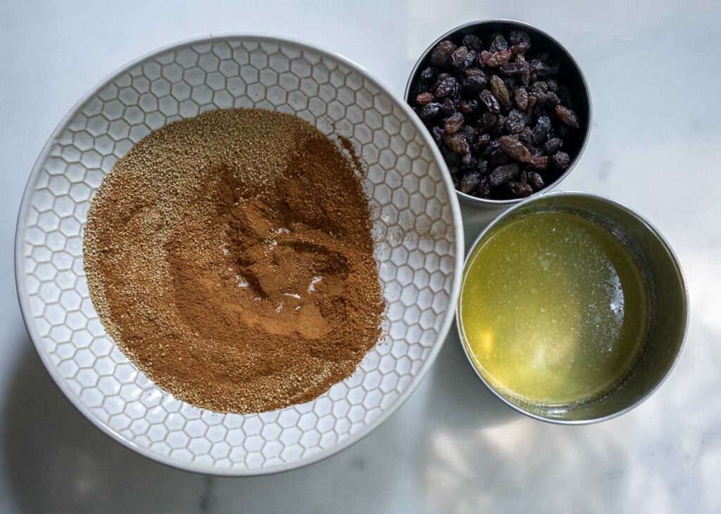 In a small bowl combine 2 tbsp cinnamon with 3 tbsp sucanat, and have your 1/2 cup raisins ready nearby.
