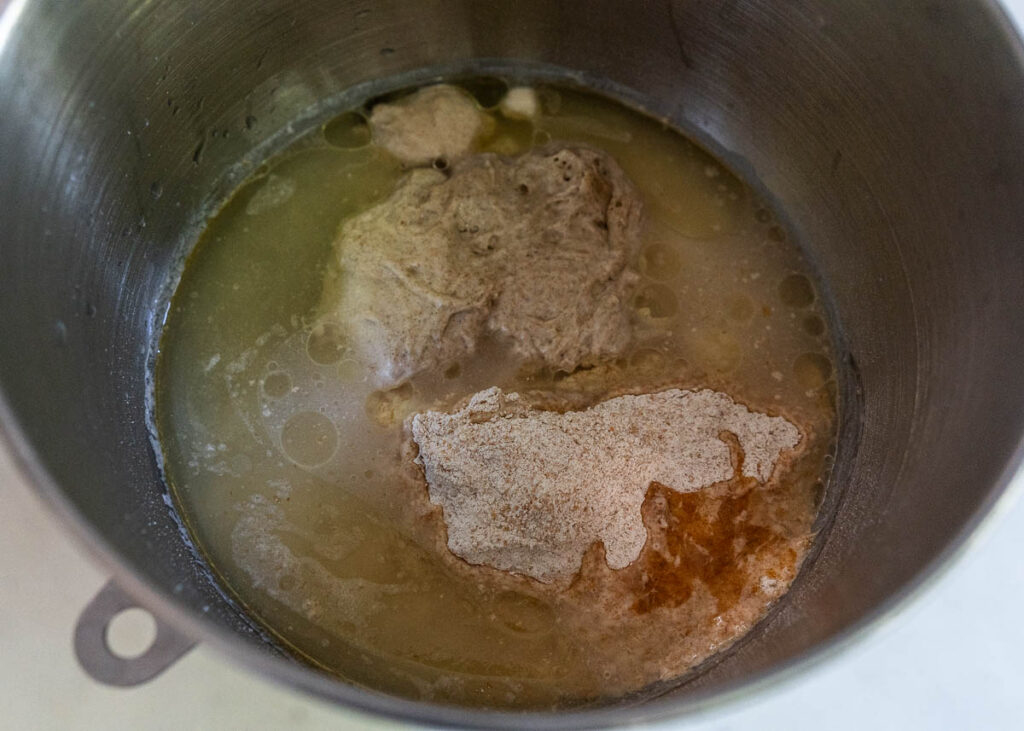 - To the bowl of a stand mixer, add all the dough ingredients: bread flour, whole wheat flour, sourdough starter, filtered water, maple syrup, avocado oil, and salt