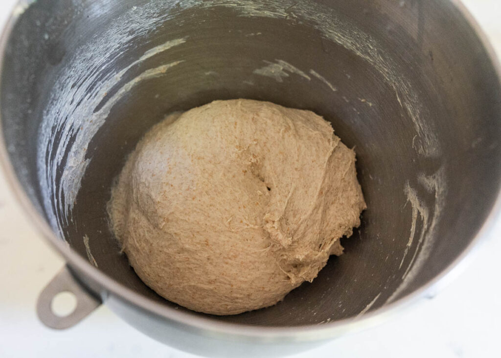 On medium-low speed, mix the dough for 10 minutes until the sides of the bowl start to come clean and all the dough stays together in a large mass. If needed, pause a couple of times to push the dough down the hook so it all develops evenly.