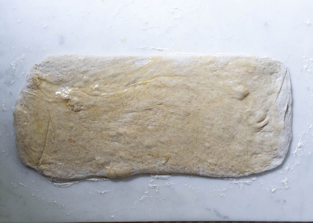 Using a rolling pin, roll out the dough into an 8″ by 18″ rectangle. If needed, flip it once or twice to make sure that it is evenly floured and won’t stick to the work surface.