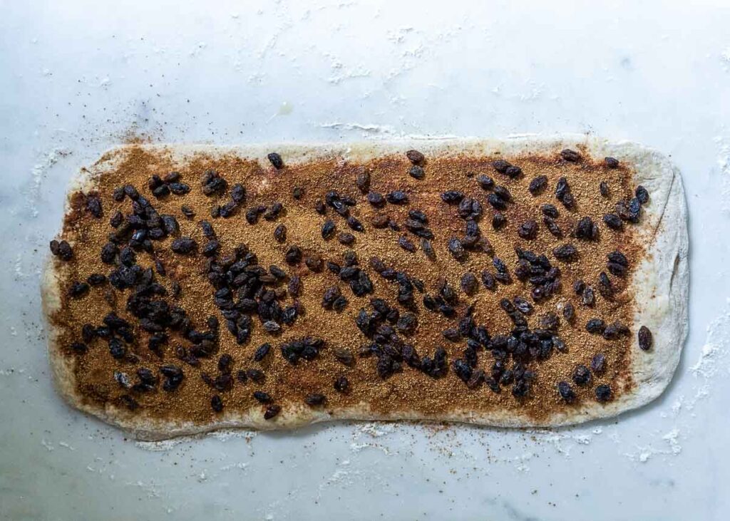 Finally, sprinkle the 1/2 cup of raisins evenly across the dough.